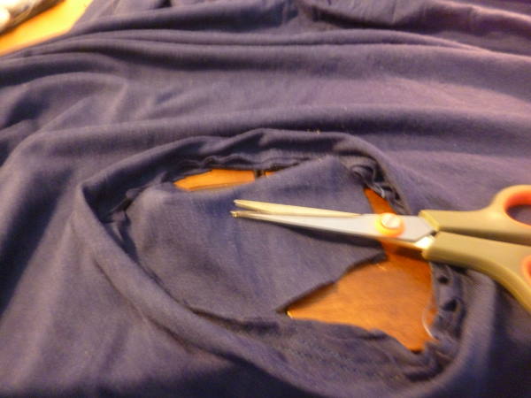 Carefully snip out the center portion of the neck holeAnd here you can see the slits extended to cut out the entire center of the circle.