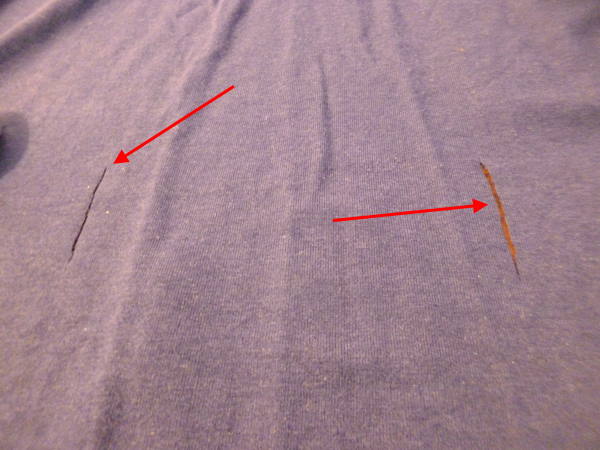 Notice the red arrows showing the slitsCut two lengths of fabric diagonally, about one and a half inches wide. This creates bias tape. They should be around 12 inches long, or a bit longer, depending on how closely fitting you like your necklines.